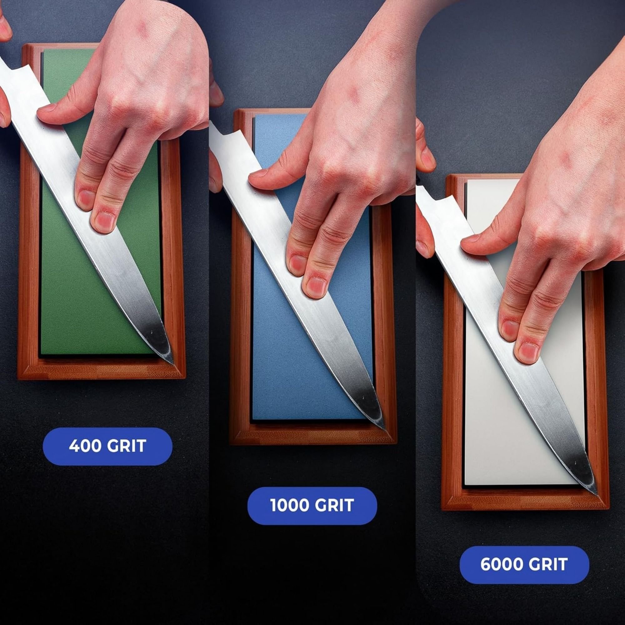 Extra Large Whetones : Larger, thicker, oversized stones measure 8-inch x 2 3/4 inch and at a full 1-inch thickness, along with a flattening stone they have plenty of service life in them & are easy to use. These wet stones uses Water for sharpening, so no need of using expensive sharpening/honing oilsComplete Sharpening Kit : This kit comes with 3 Grit 400/1000/6000 sharpening stones set well designed to achieve Razor Sharp Edge. The 400 grit is an aggressive stone for Dull Edges. The 1000 grit is used after the 400 or as a starting point for only moderately dull edges. The 6000 grit is a very fine stone and provides a very polished edge that will cut extremely well. It also includes handmade NonSlip Bamboo base making it a robust sharpening systemWhetstone Flattener: Over time, your sharpening stones for knives will naturally become uneven, making it impossible to get ultra sharp razor edge. whetstone flattener is designed to keep your sharpening stones flawlessly flat and ready to use in just minutes. With timely use of flattening stone & leveling the grinding stones surfaces, these knife sharpening set should last you a lifetimePeak Performance : Our Premium Whetstone Knife Sharpener Stones Set are Larger, Thicker, Well Balanced & allows precision knife sharpening without excessive resurfacing. These wetstone set can sharpen Any Blade out there, be it any kitchen knives, chef knife, steak knife, sontoku knife, paring knife, sushi knife, cleaver knife,Diving knife, Machete, Hunting Knife Sharpener, Pocket Knife Sharpener, Blade sharpener & it can even sharpen a dull SwordPrecision Sharpening : Not all knife sharpening stones set are created equal. We only source premium quality material for the manufacturing of our whetstone which will provide superior cutting performance. This tool is used by everyone, from home cooks, stay-at-home moms and DIY enthusiasts to seasoned professionals, making it a thoughtful and practical gift for family and friends