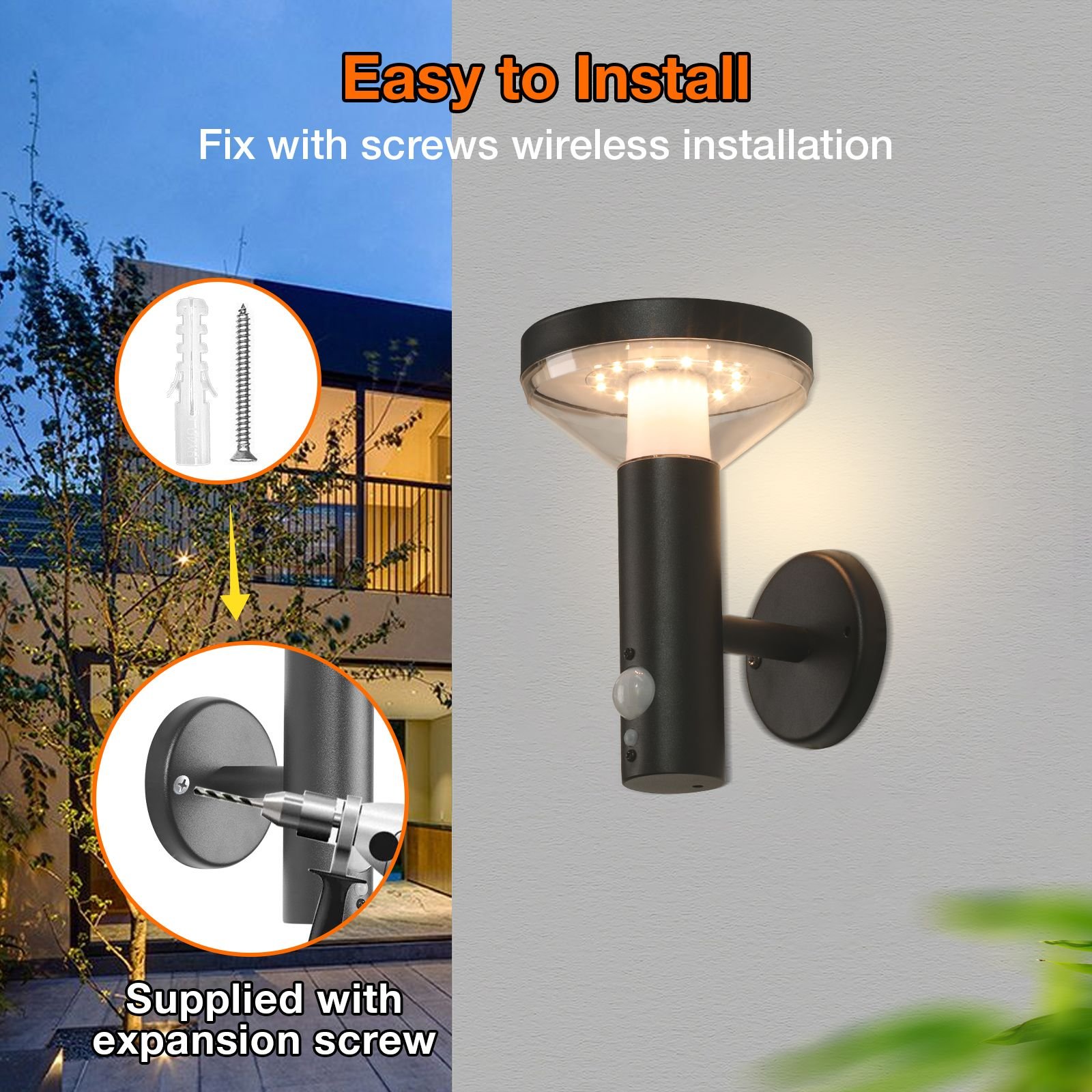 This solar sensor wall light can be installed on the porch, patio, garden, garage, entryway, courtyard, etc., high-strength aluminum, cylindrical body, waterproof, rust-proof, durable, and beautiful, installed in the home, enhance the living environment of the class.