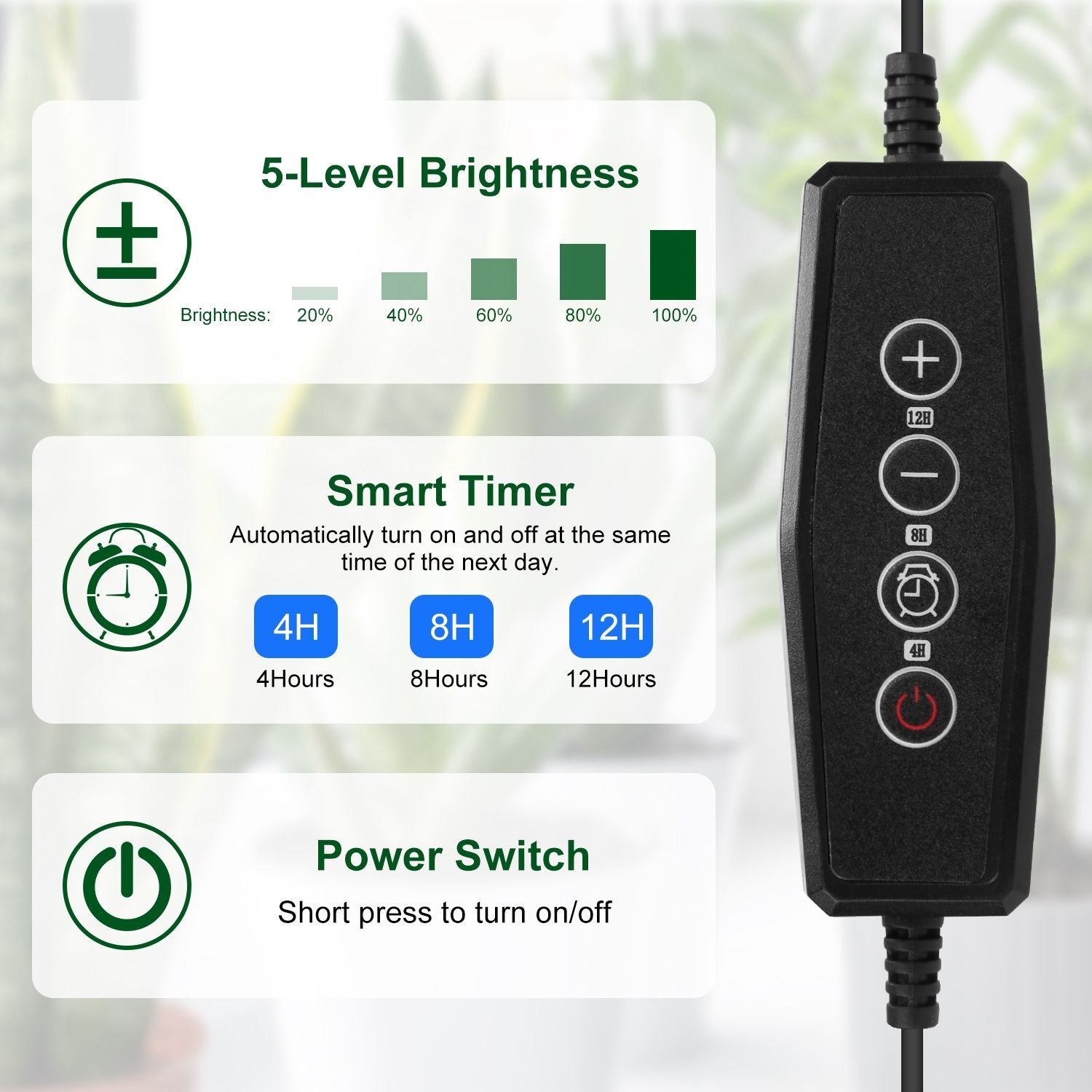 *Adjustable Brightness*:Easily adjust brightness of the grow light between 20%-40%-60%-80%-100% to meet each plant’s lighting requirements at different stages.