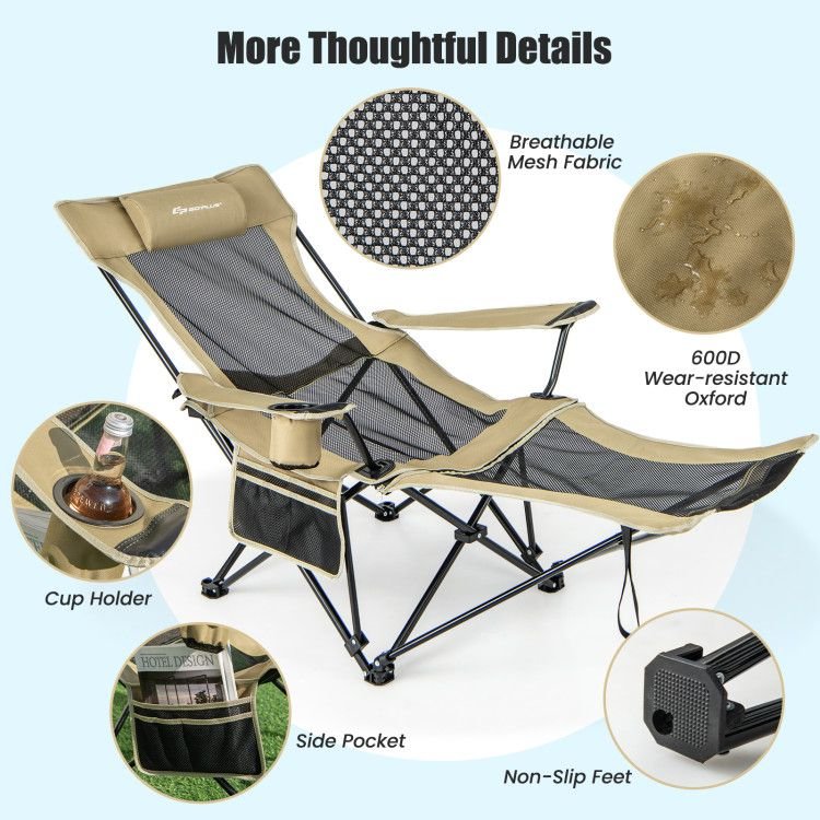 1.2 in 1 Camping Lounge Chair: Featuring a detachable footrest design, this camping lounge serves as both a recliner and a chair, providing you with different seating options for any outdoor activity. Just unzip the zippered and pull up the bottom feet, the footrest will be easily removed.