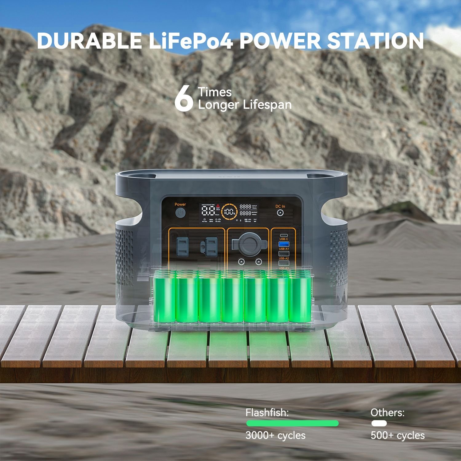 2.[LiFePO4 Long-Life Battery] - Combined with LiFePO4 batteries, Flashfish 600W power station is durable for 3000+ battery 80% cycles, means it has an impressive lifespan of around 8 to 10 years. Features with advanced BMS protection, monitoring voltage, current, and temperature to keep your LFP battery running for years.